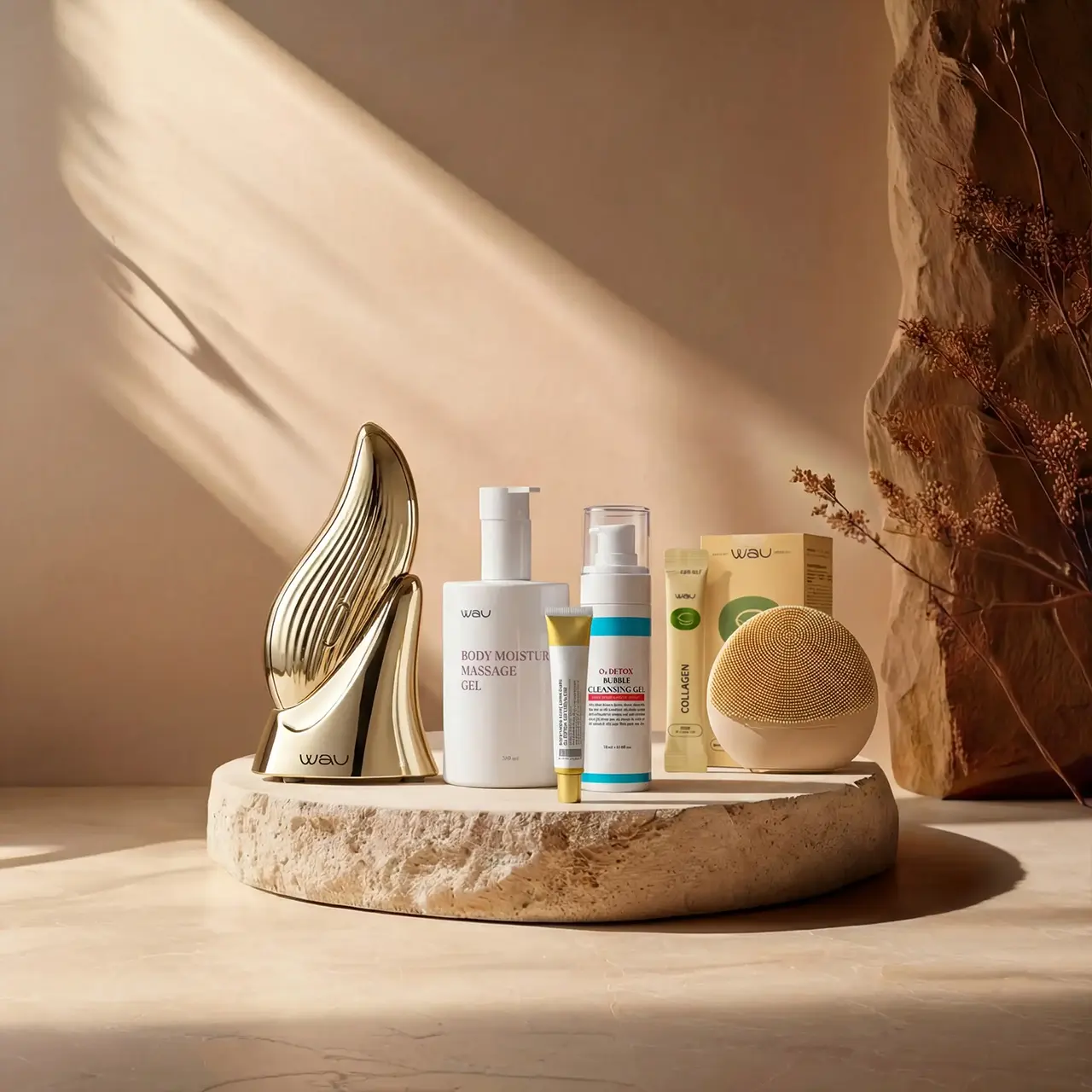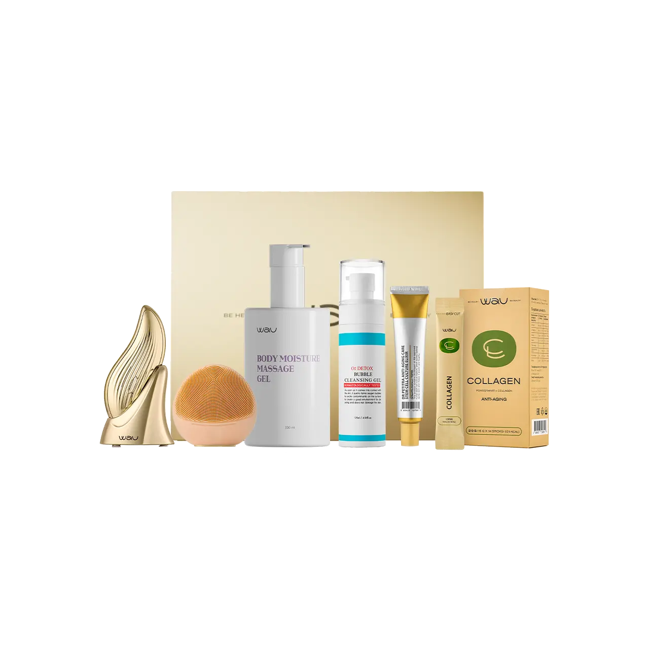علبة الهدايا تجمع بين تقنيات التنظيف والشد: فرشاة MOMO بالموجات فوق الصوتية لتنظيف عميق ولطيف، وجهاز تدليك MIO2 متعدد الوظائف بالميكروتيار لمحاربة علامات التقدم في السن. بالاقتران مع مستحضرات العناية الفعالة والكولاجين للتغذية الداخلية، توفر هذه المجموعة طقس جمال كامل لبشرة مشرقة، مرنة وشابة.